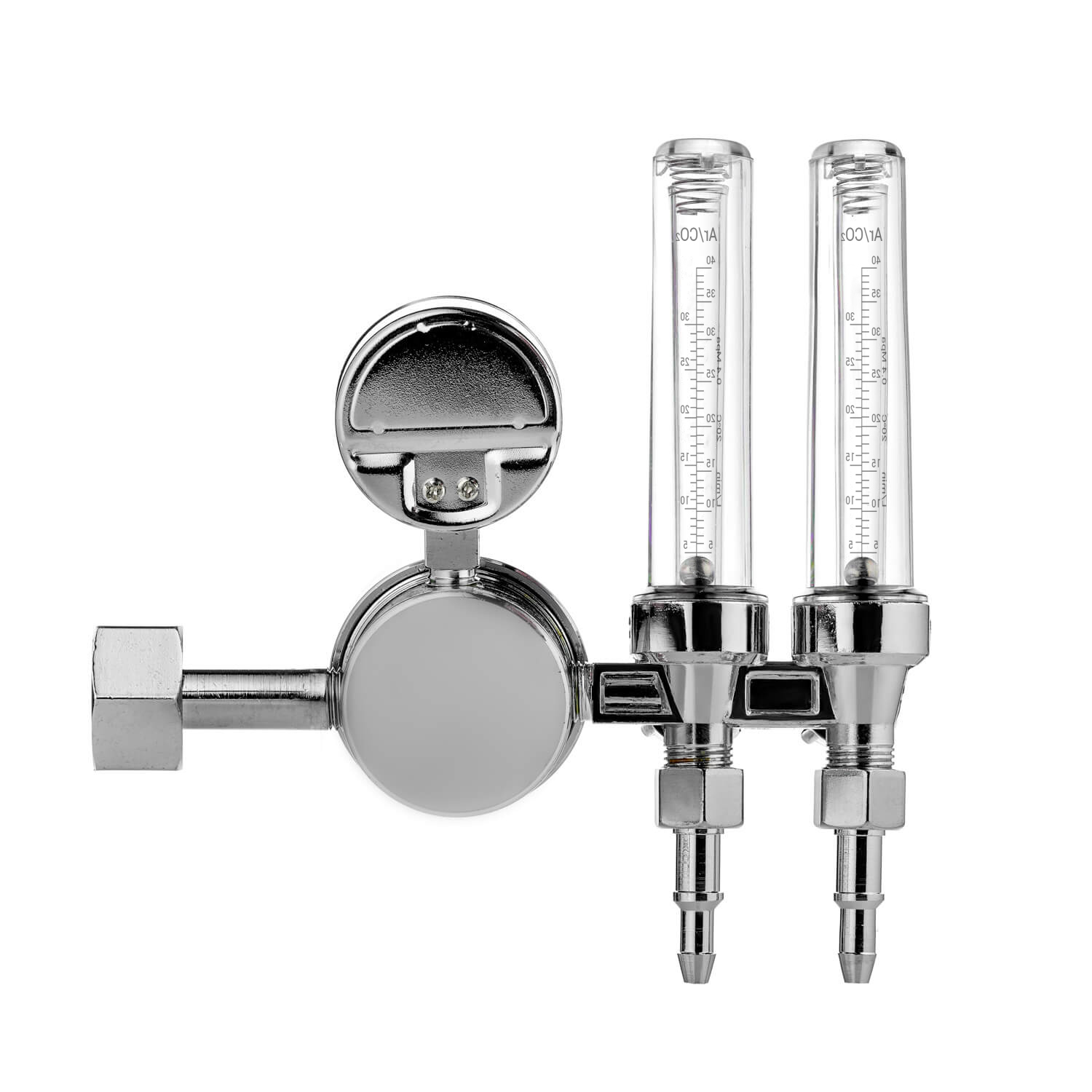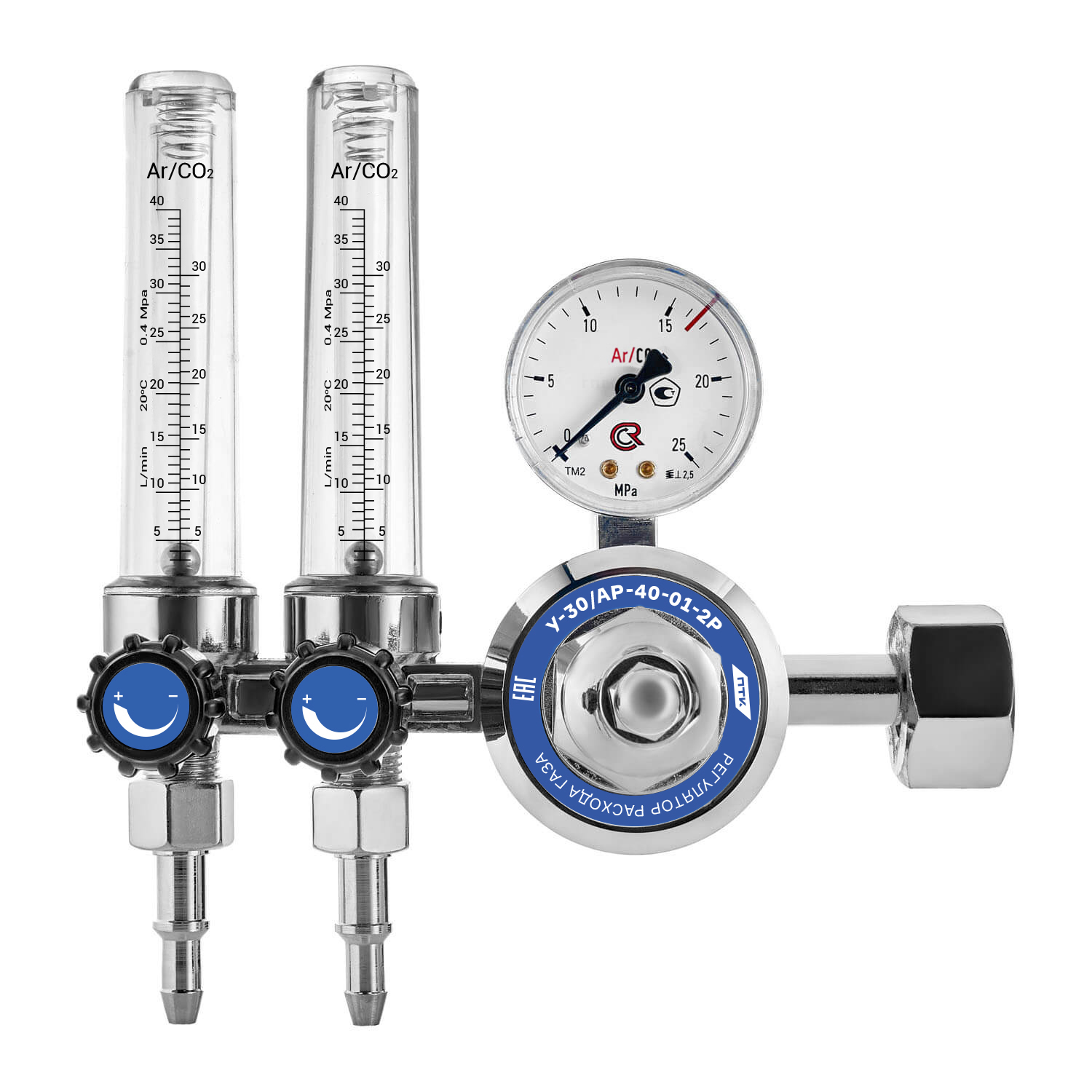 Универсальный регулятор расхода газа с двумя ротаметрами. Регулятор предназначен для углекислоты и аргона. Алюминиевый корпус. Поставляется в комплекте с универсальными ниппелями.